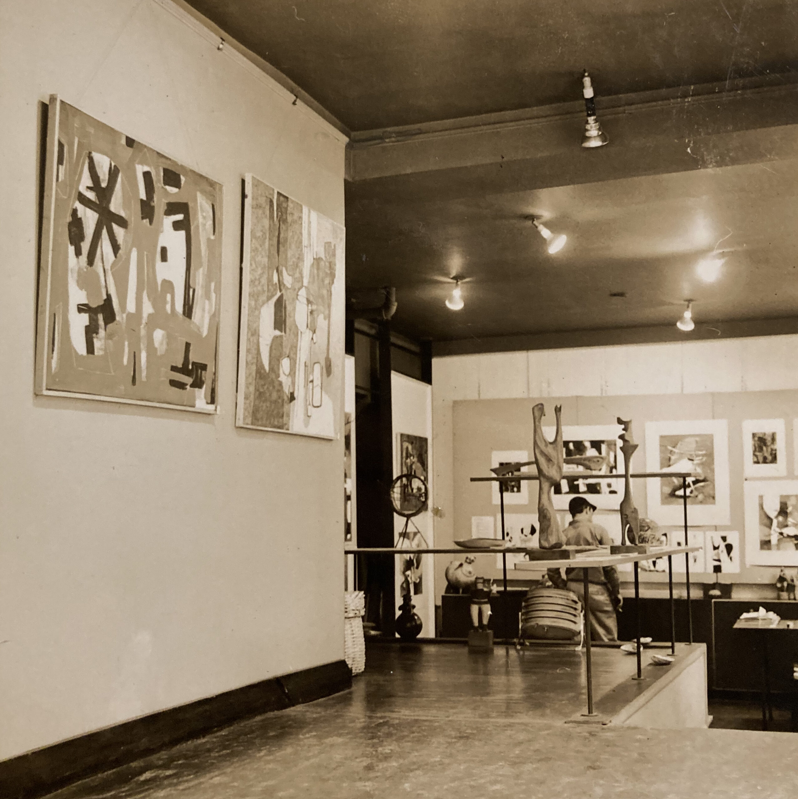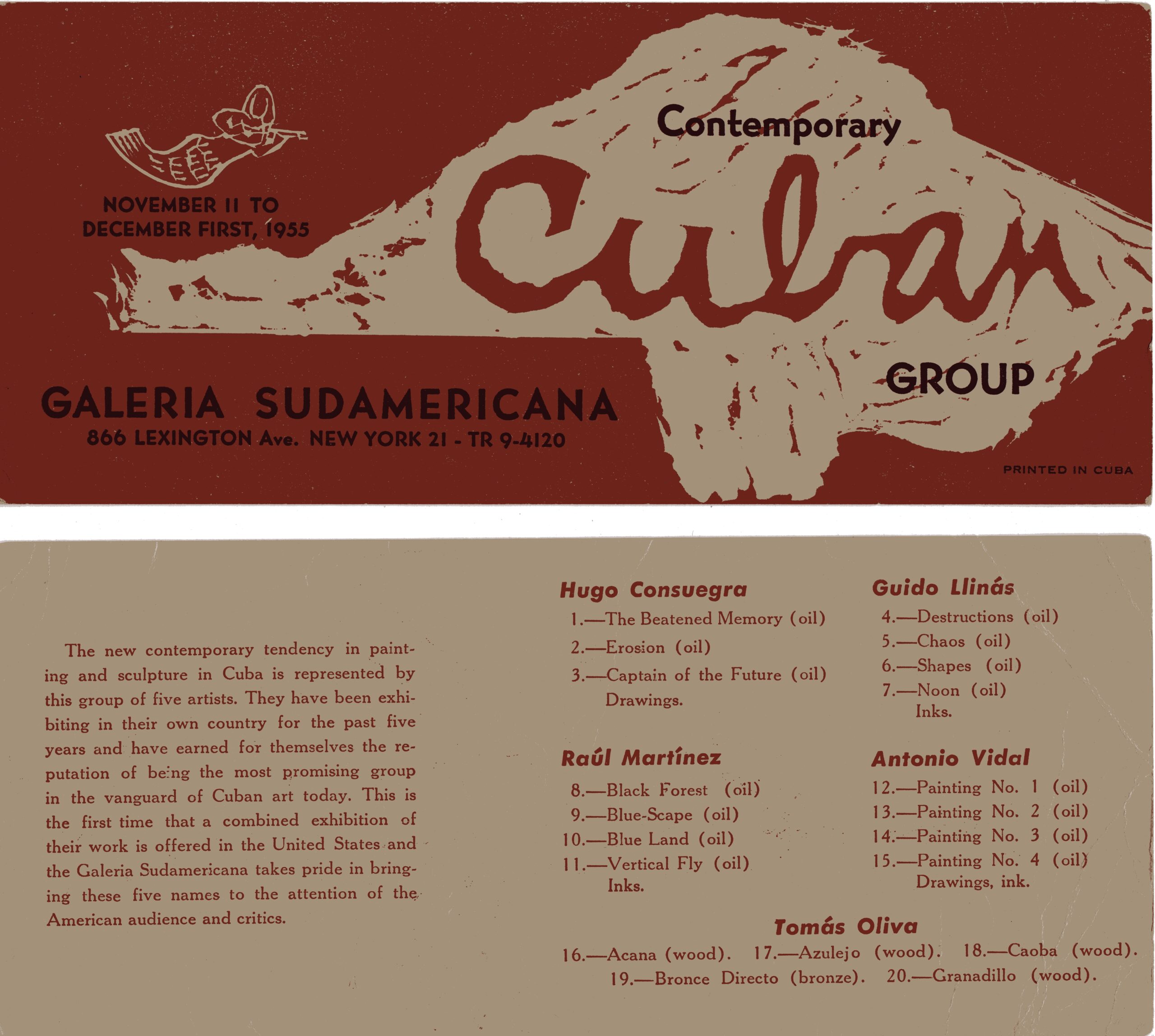 1955, New YorkChristoph Singler2025-11-17T21:47:45+01:00 À gauche, oeuvres de Guido 1955, New YorkExposition Contemporary Cuban Group, New York, Galeria Sudamericana ex1955/01